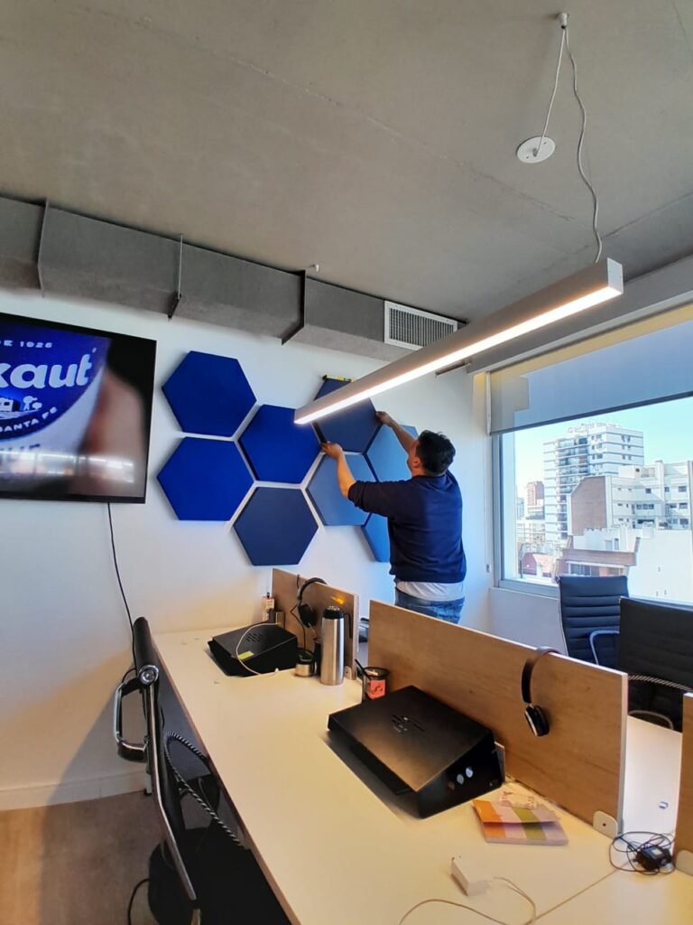 Con el tiempo, entendimos que la calidad acústica es tan importante como la calidad del sonido. La reverberación y el eco afectaban la experiencia en muchos ambientes, y fue allí donde impulsamos un cambio. Fuimos pioneros en incorporar paneles acústicos decorativos, evolucionando desde la espuma tradicional hasta desarrollar paneles de Lana de Roca Mineral, reconocidos por su alto poder de absorción y su valor estético.